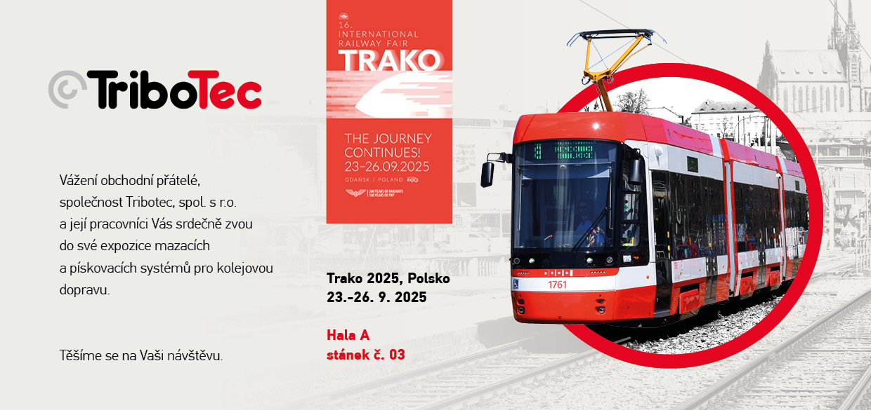 firma TRIBOTEC se bude účastnit Mezinárodního železničního veletrhu TRAKO 2025, konaného v Gdaňsku, Polsko, ve dnech 23.9. – 26.9.2025. Naše společnost a její pracovníci Vás srdečně zvou do expozice umístěné v pavilonu A, stánek č. 03, kde Vás rádi seznámíme s naší nabídkou a novinkami v sortimenti mazání okolků (WF), mazání hlavy kolejnice (TOR), stacionárních kolejových mazníků a pískovacích systémů.